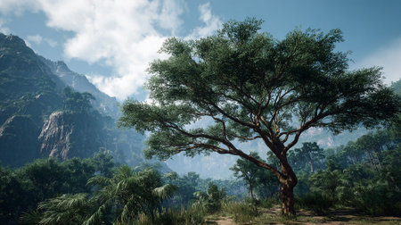 Lush Tropical Landscape with Towering Tree and Mountain Views Under Blue Sky