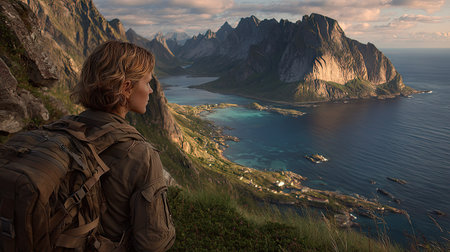 Woman hiker enjoying the view of Lofoten islands, Norway