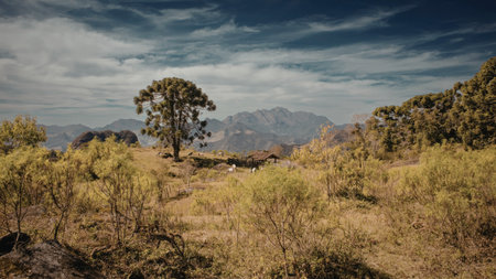 A tranquil landscape featuring a solitary tree in the foreground, surrounded by lush green vegetation. In the background, majestic mountains rise against a partly cloudy sky, creating a serene and picturesque scene.