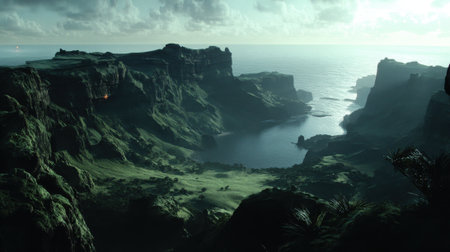 A breathtaking aerial view of a rugged, rocky coastline with green valleys leading down to a calm sea inlet under a moody, cloudy sky with bright sunlight.