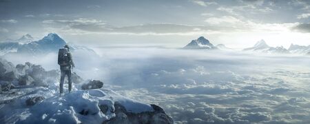 Man standing on edge of cliff and looking at the sea. 3D Rendering