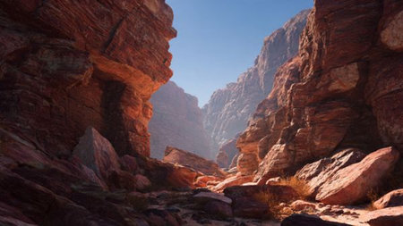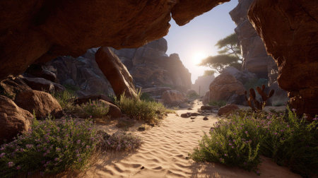 A breathtaking view of a sunlit desert canyon, highlighted by unique rock formations and lush vegetation along a sandy pathway. This scene captures the serene beauty of nature.