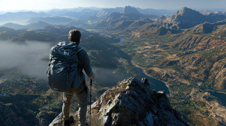 A hiker standing at a peak overlooking a scenic valley