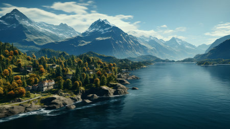 Stunning aerial view capturing a majestic mountain landscape at sunset, featuring a serene lake and vibrant sky full of clouds, ideal for nature lovers and adventure enthusiasts.