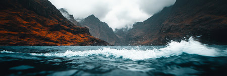 Moody seascape with waves crashing against rugged coastal cliffs under a dramatic sky.