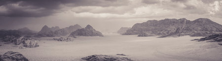 The grayscale mountain peaks above the clouds under the sky