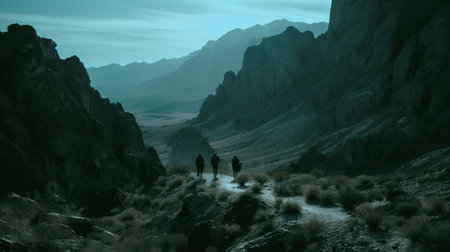 An AI generated illustration of people adventuring, exploring a mountainous terrain