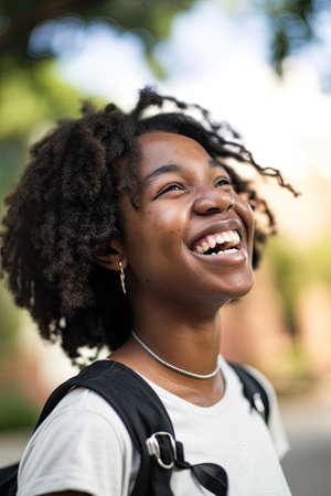 A smiling woman with a backpack on her back. African college student portrait