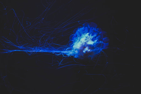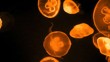 Beautiful jellyfish or medusa in the neon light in aquarium in new opened Prague medusarium in Czech Republic