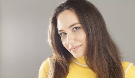 Pretty smiling joyfully female with lond dark hair, dressed casually, looking with satisfaction at camera, being happy isolated against grey studio wall.