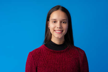 Pretty smiling girl portrait against blue background in studio