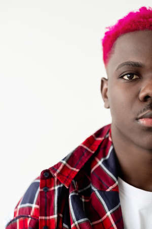 Metrosexual black man. Trendy look. Confidence strength. Control mind. Handsome stylish african guy with bright pink hair checkered shirt isolated white half face.