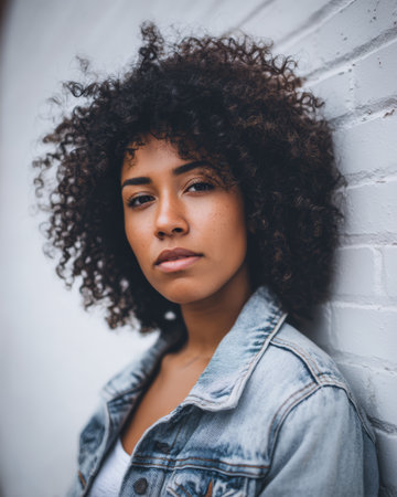 A young woman with curly hair leans against a white brick wall. She looks directly at the camera with a serious expression. The setting is simple and well-lit.
