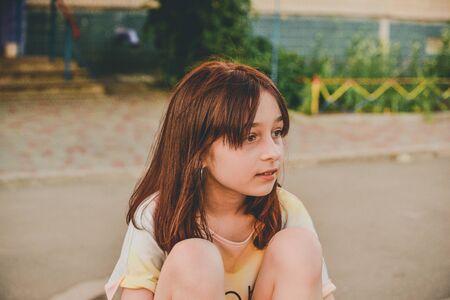 Teen girl 9 or 10 years old on the street. Girl on a walk on the street in a t-shirt. Girl with a caret and brown hair. A look to the side. holidays