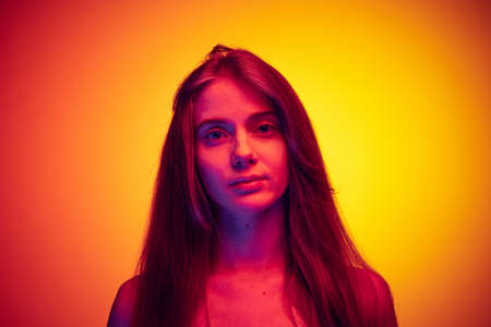 Portrait of young girl calmly looking at camera, posing isolated over gradient red yellow background in neon light
