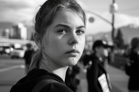 A black and white portrait of a young woman with a serious expression, captured in a bustling urban environment.