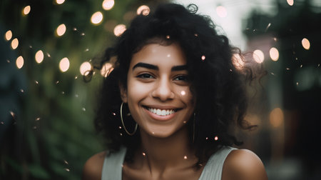 A woman with voluminous curly hair smiles at the camera, her face illuminated with vivid colors. The artistic lighting creates a playful atmosphere, emphasizing her joyful expression.