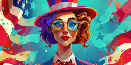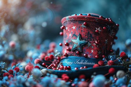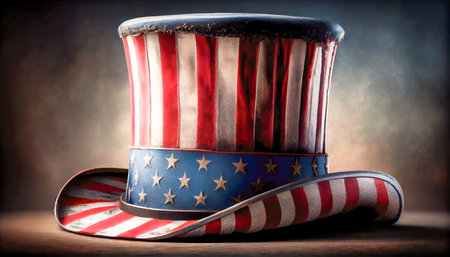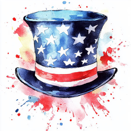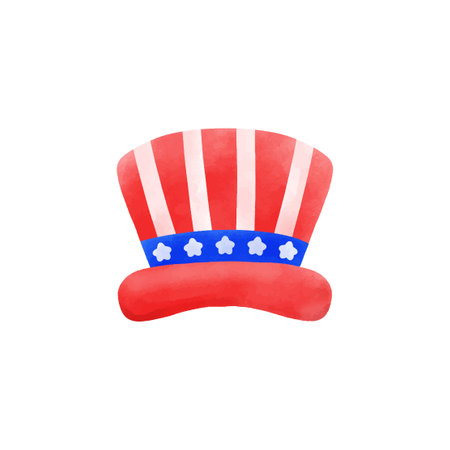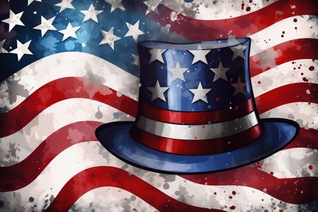 A vibrant top hat adorned with red and blue colors, stars, and stripes set against a splash of watercolor effects. Ideal for festive occasions and national celebrations, symbolizing patriotism.