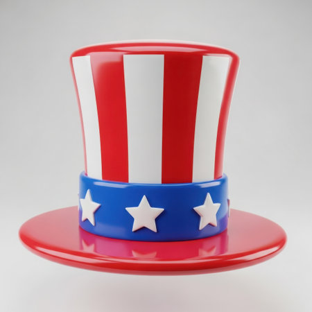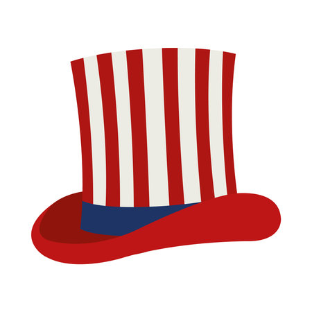 A patriotic Uncle Sam top hat with red and white stripes and a blue band adorned with white stars.