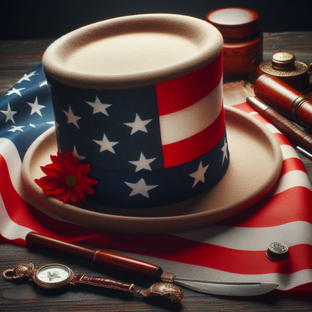 United States of America flag on top of top hat on wooden table