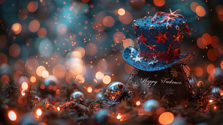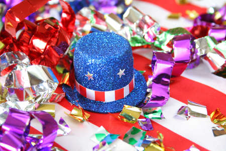 A top hat of blue glitter done in stars and stripes, surrounded with confetti all on a flag background.