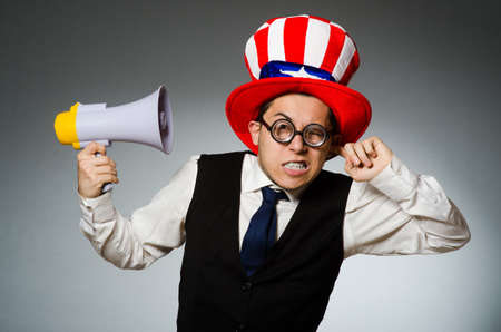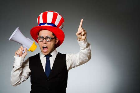 Man with loudspeaker wearing american hat