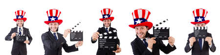 Man with USA hat and movie board isolated on white
