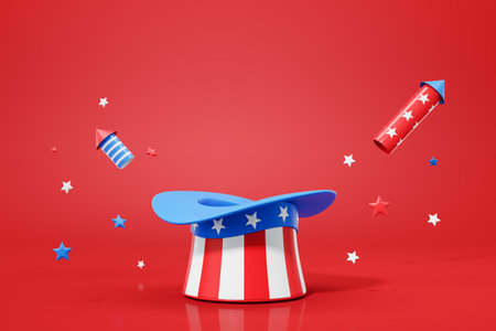 American hat with flying fireworks and stars, copy space empty red background. Concept of 4th of July, Independence Day and national holiday celebration. 3D rendering illustration
