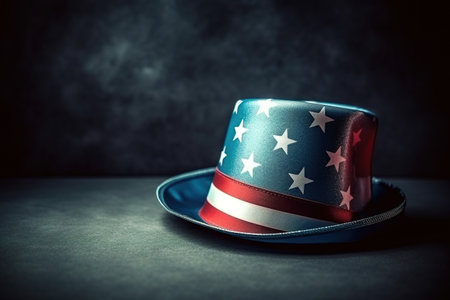 Extreme close-up of the Uncle Sam hat, tuba hat with the colors of the American flag (USA flag) above a wooden table against a black dark background with copy space. Generative Ai.