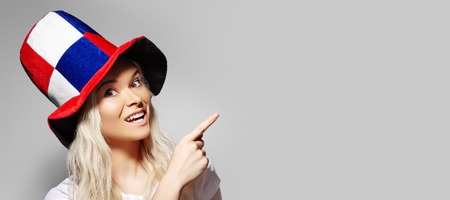 Woman surprise showing product. Smiling football fan face. Woman expressing emotions of joy, German team supporter, girl watching game