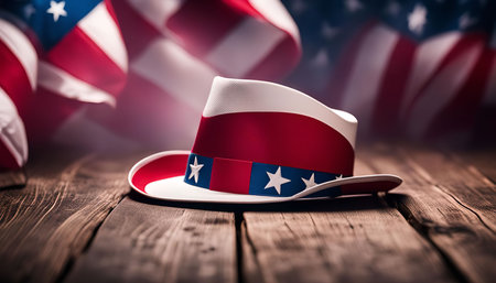 A red, white, and blue hat sits on a wooden table with American flags in the background, symbolizing patriotism and celebration.