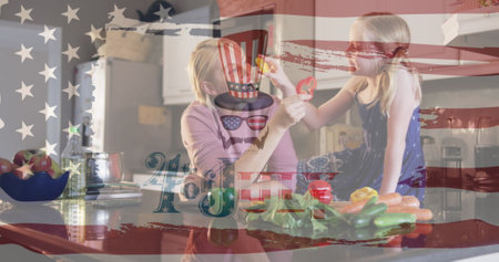 Independence text and american flag waving against caucasian mother and daughter feeding each other. american independence and celebration concept