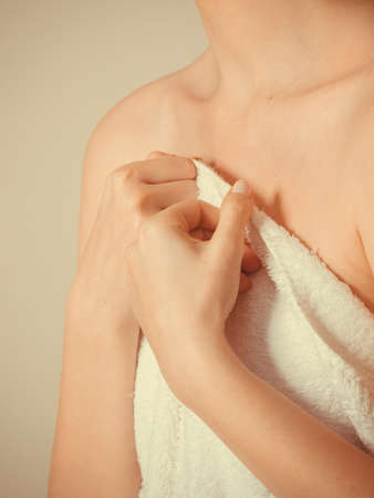 Shame and fear. Part body woman shamed of her nudity covering her breast with big bath towel. Innocence of female.