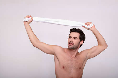 A handsome sexy confident white man with dark shirtless hair slumbers a white towel over his head, looks to the side. A naked man poses on a white background in the studio.