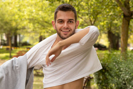portrait of young man outdoors taking off his sweater