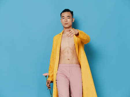 Sexy man in an unbuttoned coat with a flower on a blue background