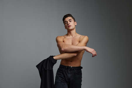 Portrait of a handsome, attractive, sexy young man, on naked torso with jacket on his shoulders, posing in studio, isolated on dark grey background. Horizontal view.