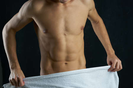 Man naked torso. Nude male abs. Sexy muscular guy. Topless fitnes body.