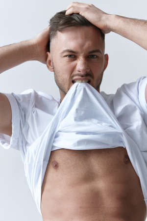 Portrait shot of handsome sexy flirting tanned man guy biting basic t-shirt touch hair posing on white background. Fashion Style New Collection Offer. Copy space for ad. Model snap
