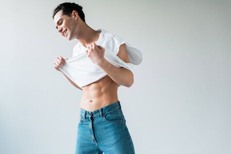 Happy muscular man touching white t-shirt while standing on white background