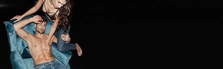 Horizontal crop of woman in bra touching muscular torso of handsome boyfriend on armchair isolated on black