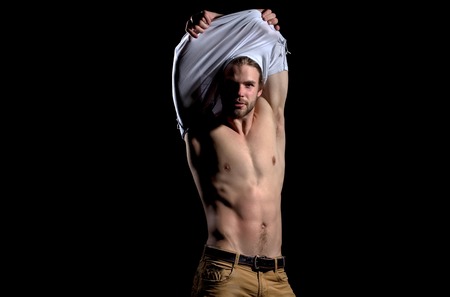 Handsome man or unshaven macho, bodybuilder, with stylish blond hair, haircut, undressing white tshirt, showing sexy, muscular torso, six packs, abs, male striptease on black background, copy space