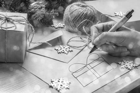 Female hand writing a Christmas letter for Santa, drawing a gift box on the table with an envelope, Christmas gifts