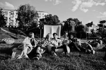 Young multi ethnic group of people watching movie at poof in open air cinema.