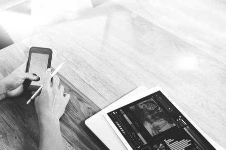 businessman hand working with stylus pen digital tablet smart phone and laptop computer. attending video conference in modern office. On wood desk. View from top. Double exposure effects, black white
