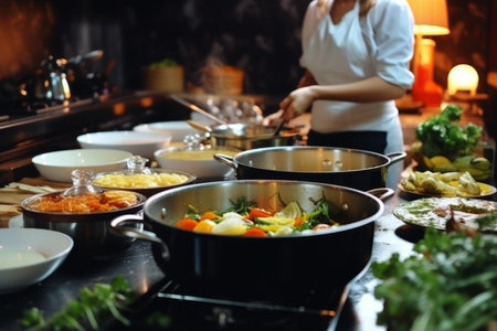 A beautifully arranged rustic kitchen scene showcases a steaming pan filled with vibrant ingredients, rustic utensils, and fresh herbs, evoking culinary creativity.