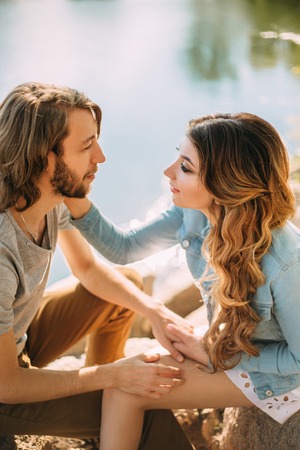 Stylish young couple. Film photo with a light and a sunlight. The guy with a stylish haircut, and with hair on his shoulders hugs a red-haired girl. Background stones and river