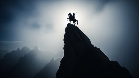 Silhouette of a horse rider on a mountain peak against a dramatic, cloudy sky. Clear details and vibrant color...