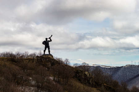 03 APRIL 2019, GEORGIA, TBILISI, Famous Didgori battle monument with giant swards and sculptures of soldiers close to Tbilisi in Caucasus mountain range