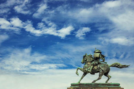 Kusunoki Masashige samurai bronze equestrian statue erected in 1897 in the center of Tokyo, against beautiful sky with clouds